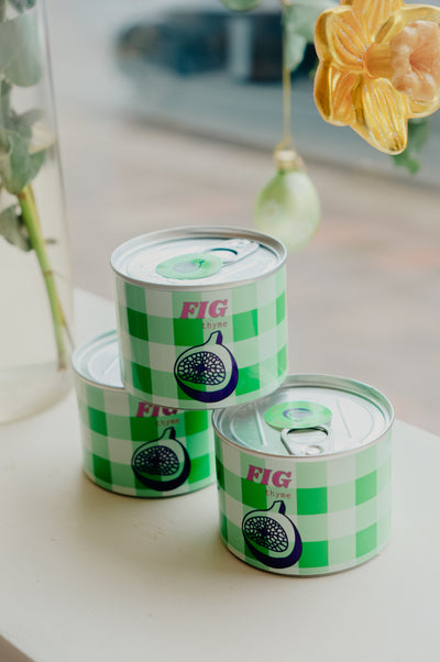 The candle taking centre window space on a summer afternoon. Peel back the tin to a fresh fig and thyme scent that is housed in a playful gingham print. Sold individually.