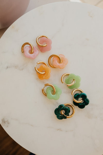 Your everyday hoop with a floral friend. Lilja Acetate Flower Hoop Earrings come in an array of cute shades are set on a classic gold hoop, allowing the flower to really have it's moment. Just want to wear the hoops solo, simply take off the flower!