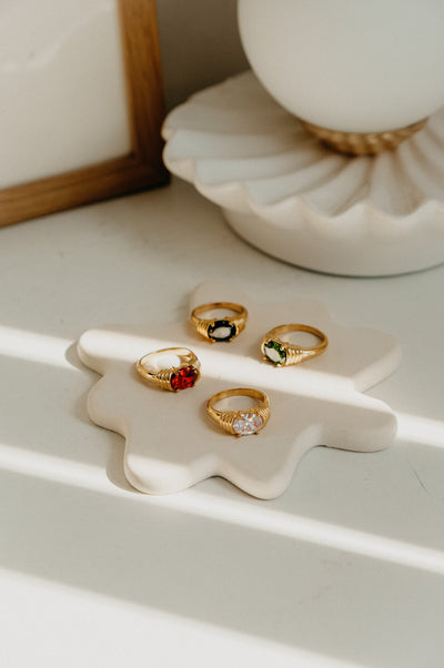 Bring all the drama with the Ola Gold-tone Vintage Style Heirloom Ring. With an eye-catching amount of sparkle set on a gold-tone retro style band, this ring gets instant heirloom status. Select from stones in red, clear, black or dark green. Gifting this ring? Your order will come complete with an Ajouter branded dust bag and gift card (add a gift message at checkout.