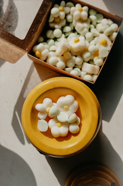 Shimmer shimmer with our vanilla sandalwood flower melts. Put a few melts into a melt burner of choice and let your space be scented in our bestselling vanilla sandalwood scent.