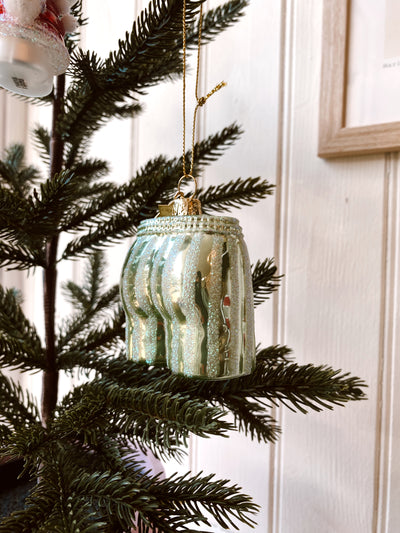 An ode to stealing your boyfriends boxers. Adorn your tree with this playful mouthblown glass sage green and glitter stripes ornament.