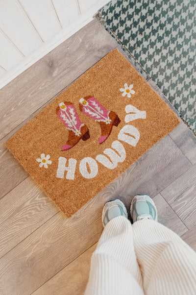 Welcome your guests with this playful Howdy Doormat. The playful font and pink cowboy boots paired with florals will be the perfect addition to your home.