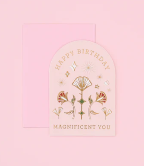 This enchanting card features a sophisticated garden of dancing flowers beneath a cosmic sky. Its heartfelt message reads 'Happy Birthday Magnificent You.' Inside the birthday card is left blank, allowing room for a handwritten message.