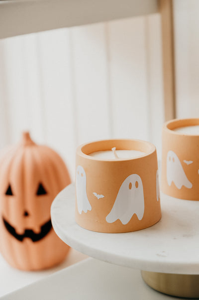 Creepy but oh so cute. The concrete orange jar features an array of white ghosts throughout. Expect fresh pumpkin with creamy coconut alongside warm spicy notes of cassia and clove, all resting on a decadent base of maple, precious woods and smoky bourbon. When finished, the jar can be cleaned and used as a pot of choice. Sold individually.
