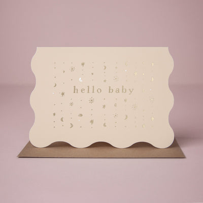 The twinkling pattern of gold foil stars and moons welcomes a new tiny human to the world on this gender-neutral new baby card.