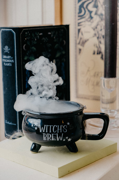 Make your morning brew even more magical with the Witches Brew Black Cauldron Ceramic Mug. Black throughout with white details and an XL handle, this mug is low and wide to replicate a witches spooky cauldron. Suitable for microwave or dishwasher use.