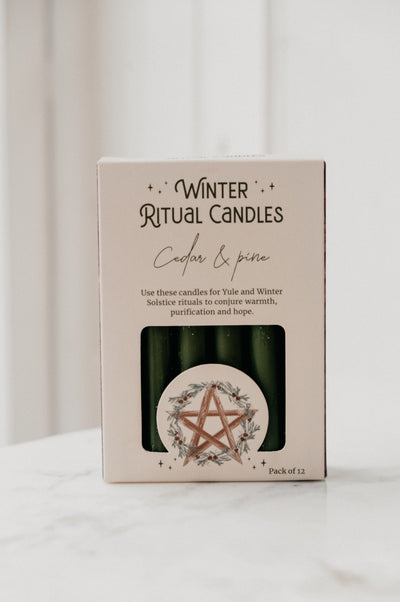 Welcome winter solstice with this pack of 12 cedar and pine scented candles. The forest green candles feature a how to guide on the back.