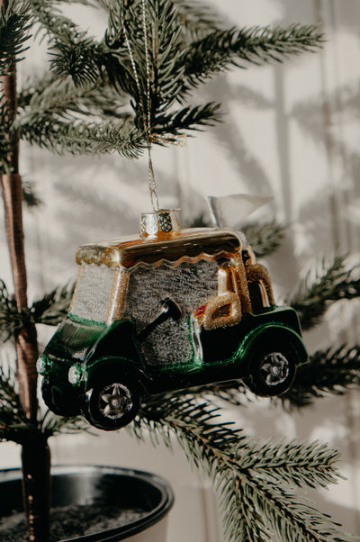 Sabrina Green Glass Golf Cart Glitter Christmas Bauble Ornament