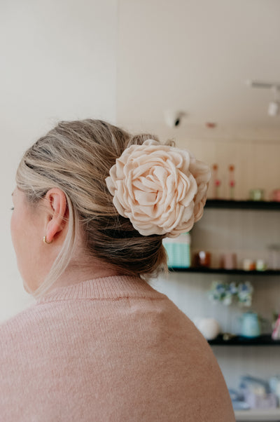 Romanticise every outfit with the Alice Cream Rose Claw Clip. The lightweight soft flower is complete with a secure tortoiseshell claw clip. Also available in other colours.