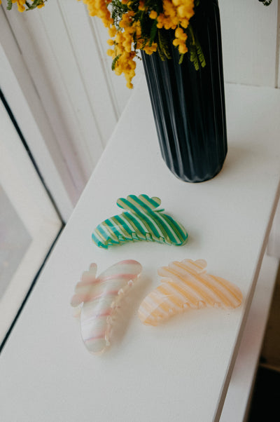 Scandi cool-girl all over with the Dina Striped Claw Clip. With stripes throughout, select from green, nude or pink that each make for for brunch dates and sunset evenings a-like.
