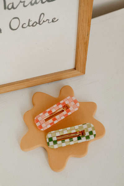 Slide your hair back in the Floris Square Checkered Acetate Hair Clip. Whether its a half up / half-down 'do or to sweep your hair back to do your make-up, this triangle checkered hair clip will be your new BFF. Secure snap closure. Select from green, pink or purple.