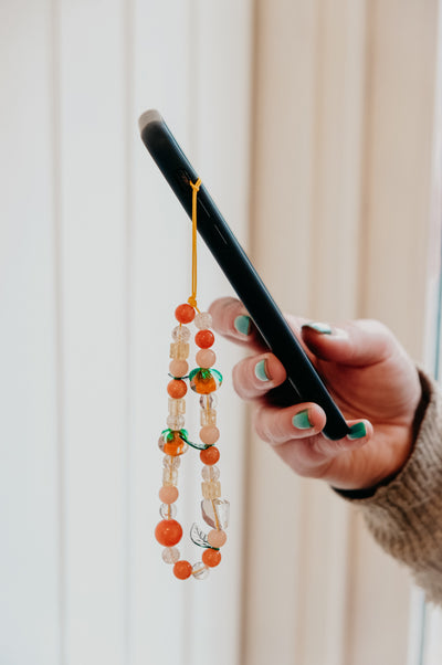 Bright tangerines are perfectly paired with lighter charms for a sweet addition to your phone or camera. Loop around a phone or camera to create a hands-free accessory.