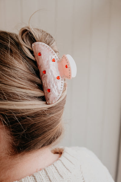 Full french roll or a half-up-half-down, the Lola Pink Marble Red Heart and Crystal Diamante will be your go-to. A comfy and cute claw clip that is made from extra durable eco-friendly material that will suit all hair types - including box braids and thick hair.