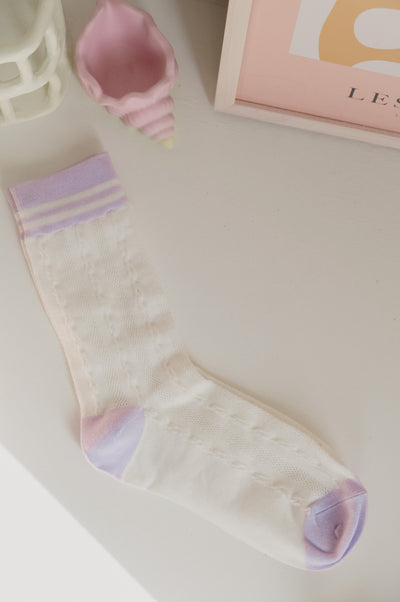 Dial up your sock drawer with the Lulu Lilac and White Stripe Ankle Socks. Featuring a white base with light detailing and pops of lilac that make for a fun take on a classic sock. Perfect with a cute floral mini dress and trainers.