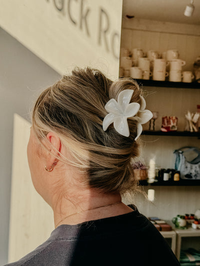 Vacay vibes all over with the Moana White Bloom Flower Claw Clip. The white flower claw clip will bring a summer aesthetic all year round.