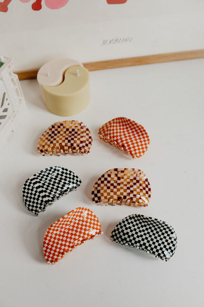 We are here for 70s check styles. Select from orange, amber or classic black in a soft curved style for a retro vibe and is perfect for fine or thick hair a-like. The acetate style features a secure crocodile snap closure making it the perfect hair accessory for all hair types. Sold individually.