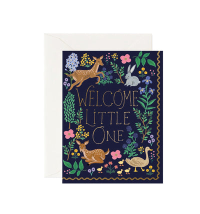 Welcome their latest bundle of joy into the word with this gender neutral card. The luxe dark base is complete with mega cute woodland animals.