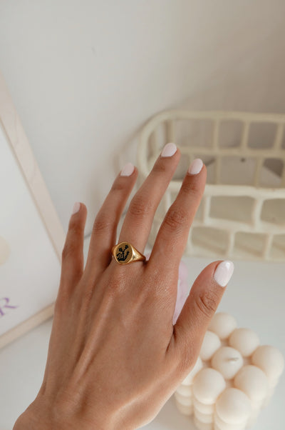 Step up your ring stack with the Yara Flowers Signet 18k Gold Plated Ring. Featuring an elegant bunch of wildflowers that are set on a vintage-style gold signet ring. The lightweight style can be worn solo or stacked with our styles. Comes complete with an Ajouter cotton and ribbon dust bag.
