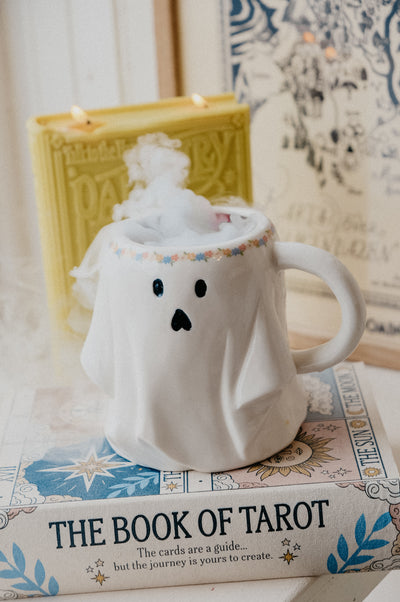 Spooky but sweet vibes all over with the Gracie XL Flower Crown Ghost Mug. The all white ghostie mug features a flower crown making the mug perfect for any season!