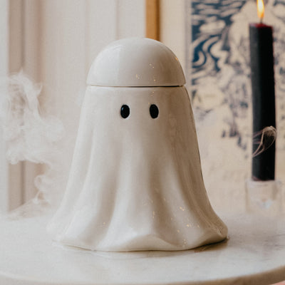 Keep all your creepy bits (or cookies!) in the Gus Ghost White Ceramic Jar. The all white ghost features a flicky edge for a floating look! Suitable for anything from cookies, pens to trick-or-treat sweets.