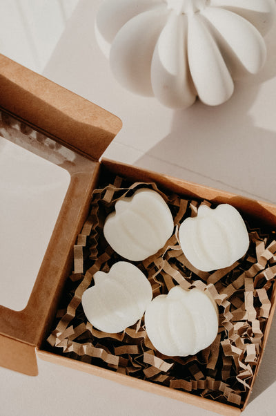 Complete your fall decor with the Pumpkin Chai Autumn Wax Handmade Vegan Melts. Welcome top notes of creamy pumpkin, cinnamon, clove that are balanced with raspberry, blackberry and cherry apple for a candle scent that is elegantly sweet yet spicy. Each wax melt comes with a little bit of sparkle. Comes complete with a box.
