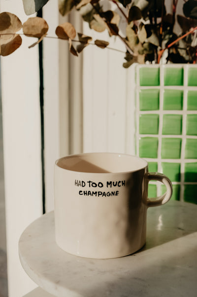 When you need an XL coffee after a fun night! In a neutral glaze the mug features a handpainted slogan 'had too much champagne’. Finished in a lightly hammered style and a round handle (yes, we can confirm it's super easy to hold!). Sold individually.