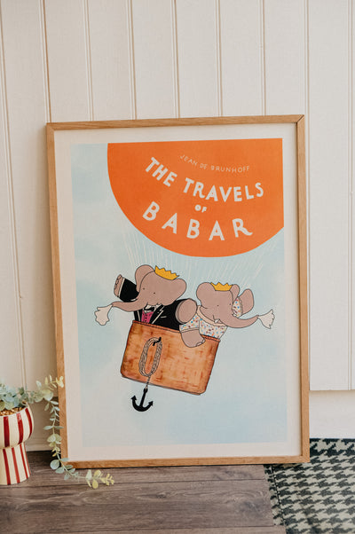 Inspired by Babar the little elephant book by French Artist, Jean de Brunhoff. From a bedroom, living room to a nursery or office space, this Travels of Babar Print print will suit just about any area of your home. This print is perfect as a stand alone piece or an addition to a feature wall.