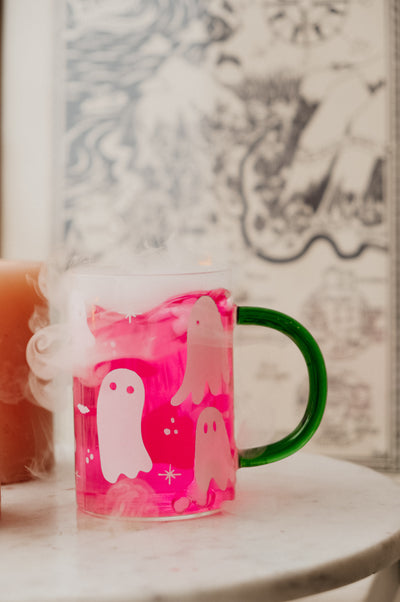 Sip your morning coffee in our spooky Halloween Ghost Mug. An array of cute (not so creepy) ghosts, bats, sparkles and is complete with a glass green handle. Handwash only. Sold individually