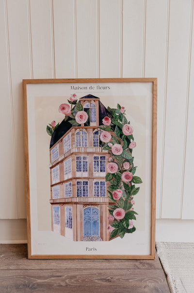 Parisian elegance with the Paris Flower Houses Artwork 50cm x 70cm. Pink florals are wrapped around a pretty Paris building that make for a statement wall art design. ​Can be styled as a stand alone piece or an addition to a feature wall.