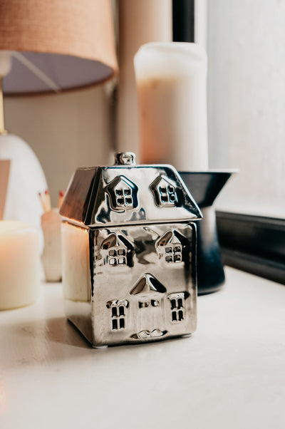 Scent your space with the Metallic Townhouse Wax Melt Burner. Lift off the top of the house and add a wax melt of choice, turn the melt burner and place a tealight underneath. With an open window style the tealight peeps through creating the perfect finish to a cosy vibe. Wax melts sold separately.