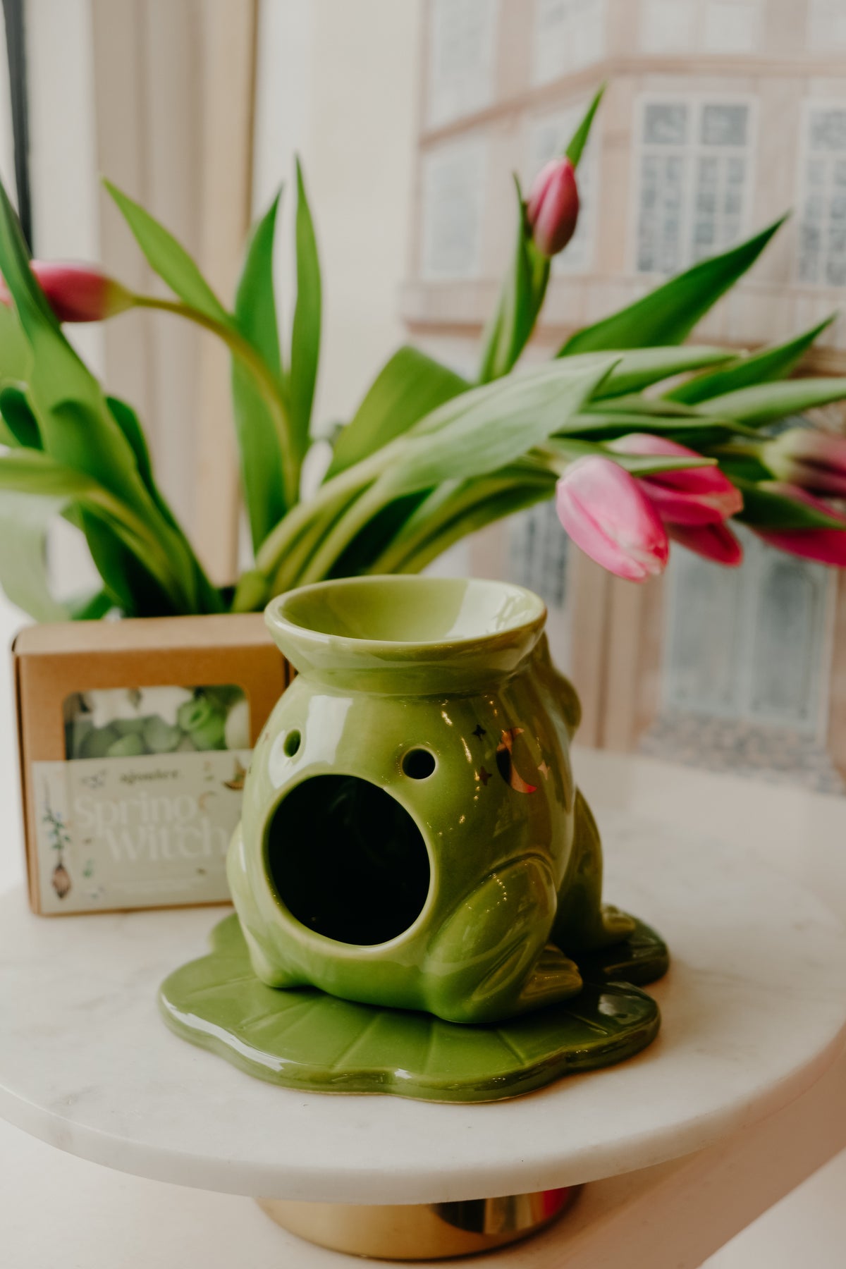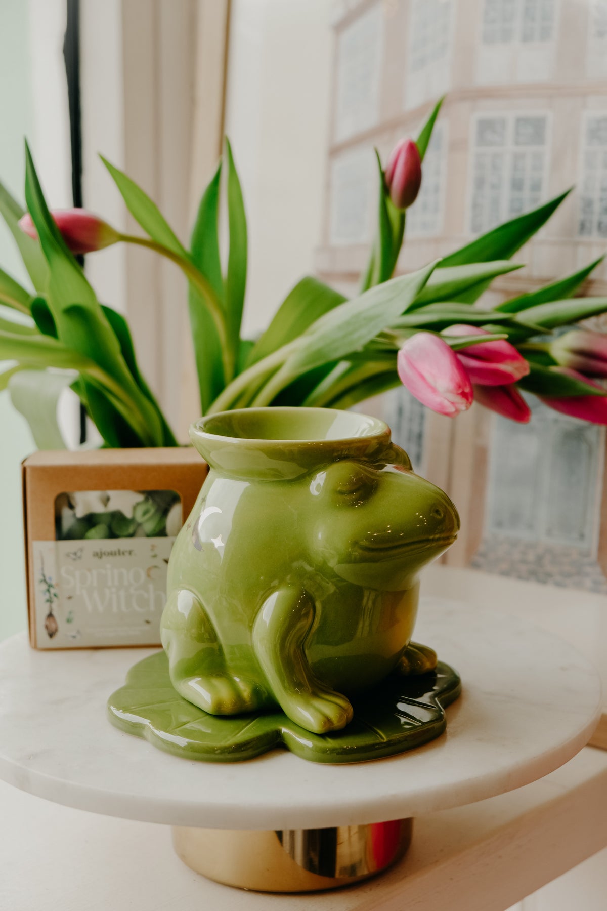 Frog decor will forever have a place in our hearts. The all green frog shaped wax melt burner features gold moon and stars and is complete with a lily pad. Whimsical cottagecore aesthetic that will work with most interior types. Wax melts sold seperately.