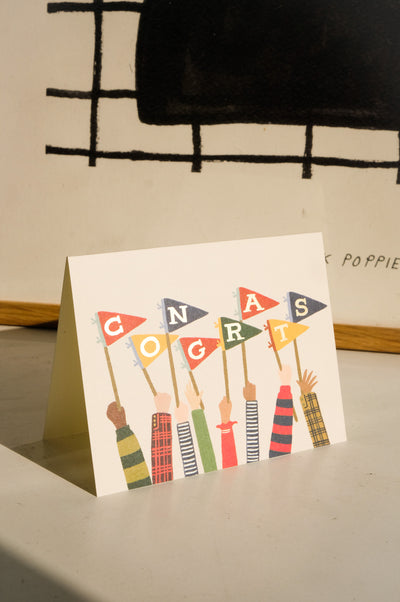 Celebrate that special moment with this Congrats Pennant Flag Greeting Card. Set on a natural white background, with rich colours and gold foil lettering. Open the card for a blank interior that allows your message to take centre stage.