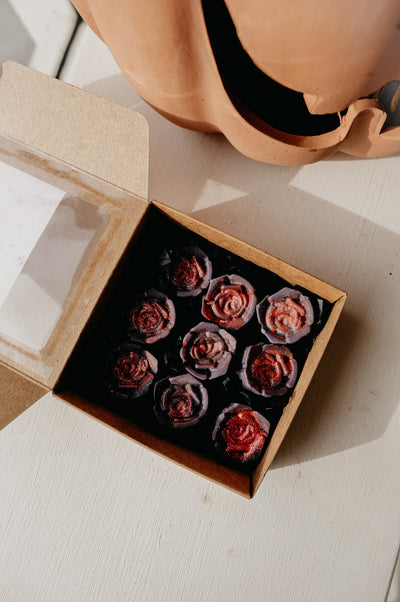 Handmade at Ajouter HQ, these Peony Blush melts are in the shape of black roses with red shimmer. Put a handful into any burner of choice and watch as the melts turn into a pool of shimmer.