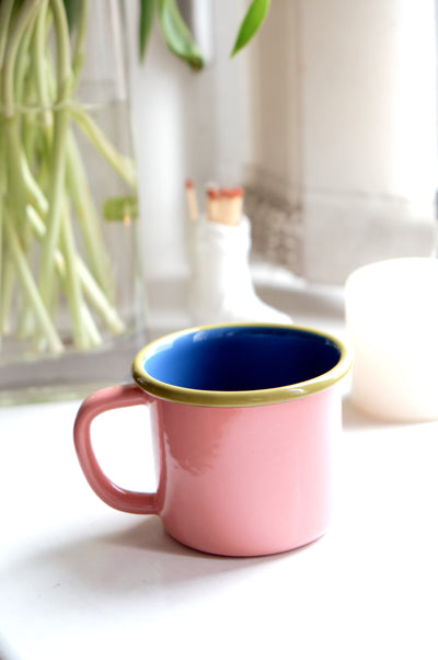 A playful and punchy mug in pink with an olive trim and striking blue interior. Made by fusing glass onto heavy-gauge steel this piece will be a forever staple in your collection. Every piece is handmade individually.