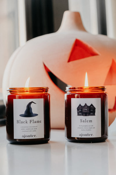 Twist the bones and bend the back… strike a match to our handmade Halloween Black Flame or Salem Soy Wax Candle.