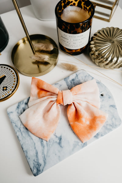 Swish your hair in the Haley Orange Pastel Tie Dye Hair Bow. Level up the femme with an oversized hair bow in an on-trend pastel tie dye. Also available in blue, nude, yellow and red - all pastel of course.