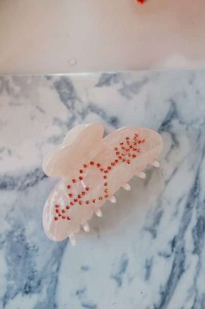 Rhinestones, pink pearl shimmer and hearts - L.O.V.E all over. The pink pearl shimmer claw clip features a rhinestone bow and arrow that will be make for a super cute date night addition. Comes complete in an Ajouter dust bag.