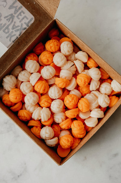 Handmade at Ajouter HQ, these Pumpkin Chai melts are in the shape of jack-o-lanterns. Put a handful into any burner of choice and watch as the melts turn into a pool of shimmer.