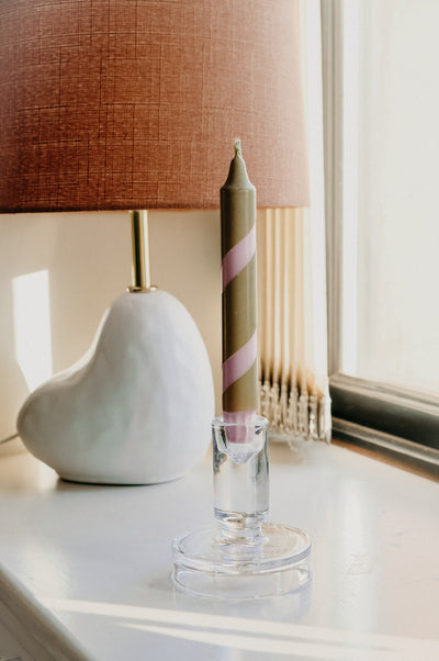 Add a classic yet playful touch to your next tablescape with the Sage Green and Lilac Twisted Pillar Candle. The hand-dipped style is a fun take on traditional pillar candle. Glass candle holder sold separately.