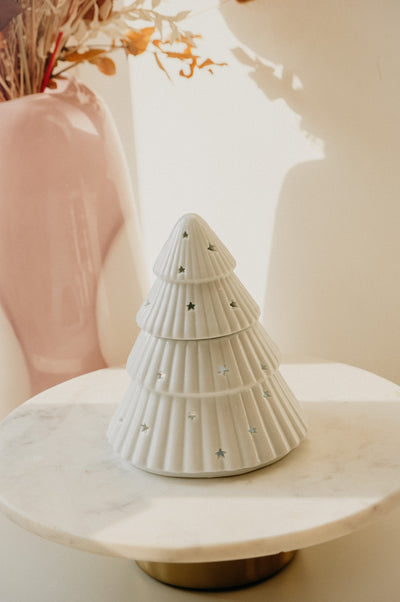 In classic white with a star cutouts, the White Christmas Trer Wax Melt Burner has a dipped top to hold an oil or wax melt. Simply light a tealight to infuse your space with a scent of choice and create the perfect festive space.