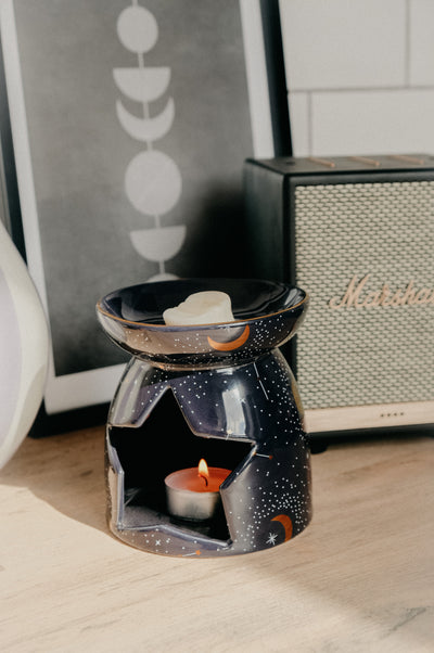 An array of constellation, moon and stars are set on a navy wax melt burner with gold details. Insert a tealight into the star shape window and put a wax melt into the circle dish to create a magical ambiance. Comes complete with a gift box. Wax melts sold separately.