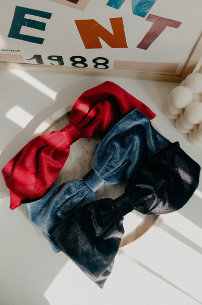 Feel every inch a lady with the Alva Velvet Big Bow Hair Clip Barrette. Delicately gather your hair in either a red, blue, or black bow and secure silver chrome clip closure. Sold individually.
