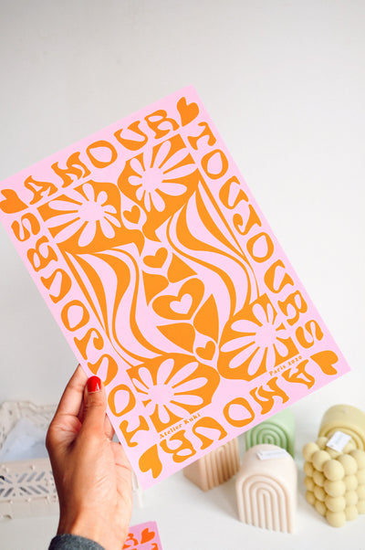 Amour Toujours (love always) from French artist Atelier Kuki based in Paris. Featuring an orange and pink combo of 60s style florals and love hearts. Suitable for home, office, museum, or gallery display and will work solo or as an addition to a feature wall.