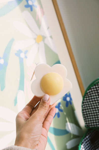 Brighten up your space with the Chunky 60s Flower Handmade Candle. The chunky white candle features a yellow inner. Each candle is handmade at Ajouter HQ from 100% natural soy wax and natural dyes and comes complete with a branded dust bag. Sending these candles as a gift? Don’t forget your gift message at checkout!
