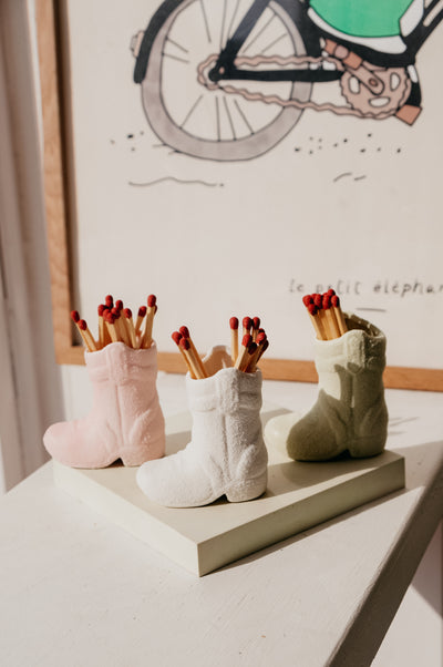 Light your fave candles or smudge with our Cowboy Boot Ceramic Match Striker. The grainy textured ceramic boot style has a striker on the base and comes complete with matches. Can also be used as a cute ornament and storage for small pieces of jewellery. Sold individually- select from white, pink or green.