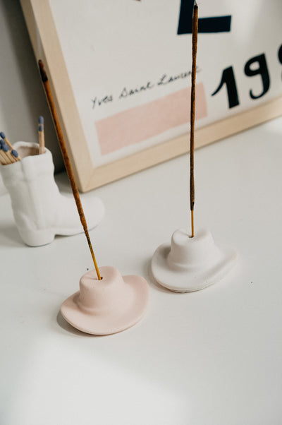 A nod to western style with the Cowboy Hat Ceramic Incense Holder. Indoor or outdoor, this will be a cute table or shelf addition that can be paired with an incense of choice. Due to the natural materials used to create this handmade product their may be small air holes. Sold individually- select from white or pink and incense sold separately.
