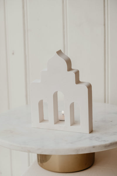 Whether it's for a Ramadan decor piece or an Eid gift, this minimal home addition will work with all interior types. The mosque design can be styled alone or with a tealight in the back (there is no stand for the tealight you simply place one behind - you can also used a LED tealight. This item is made for eco-friendly concrete and therefore there will be small air holes and cracks.