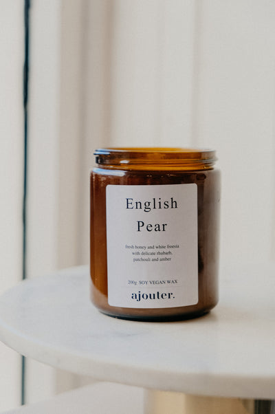 Strike a match and set the mood with the English Pear Soy Wax Handmade Candle. Expect a fresh scent that features top notes of honey and white freesia that are balanced with rhubarb, patchouli, amber and white musk. Comes complete with an Ajouter dustbag.