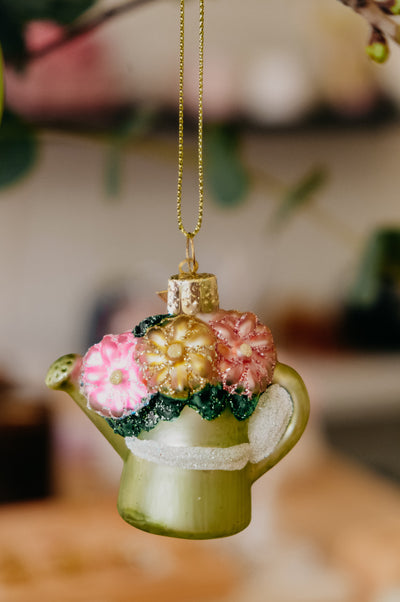 This glass sage green watering can with flowers will be a staple in your easter decor for years to come. Hang from a tree to create the perfect tablescape.