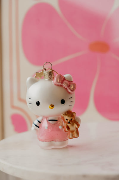 Cue cuteness vibes all over with the Hello Kitty  Stripe Top with Bear Glitter Glass Ornament . The glass ornament features our girl in a stripy top, pink dress holding a teddy bear. Whether as a valentines, galentines or to show your self some love, this will be a gift to cherish.